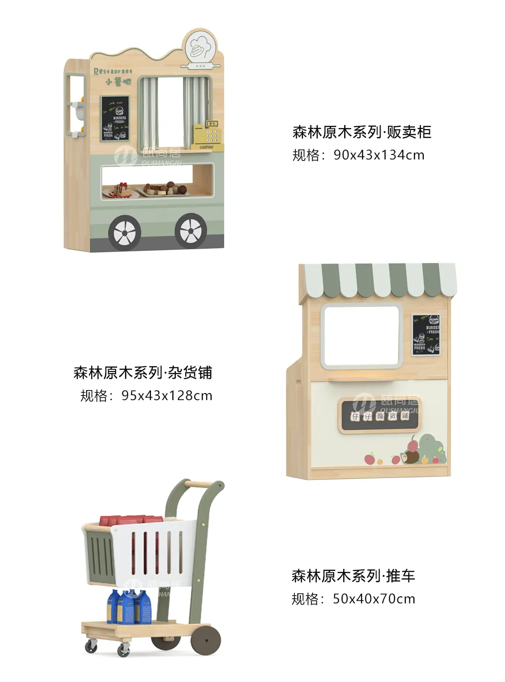 販賣小餐吧、雜貨鋪等貼近生活的場景,激發兒童的游戲興趣,培養兒童的合作意識和扮演能力。